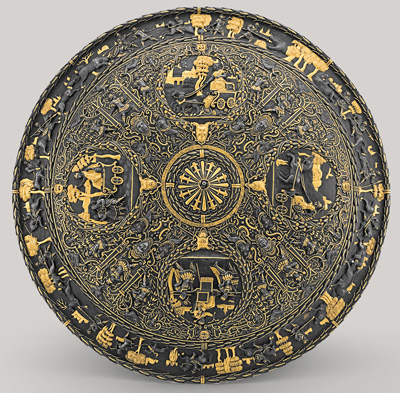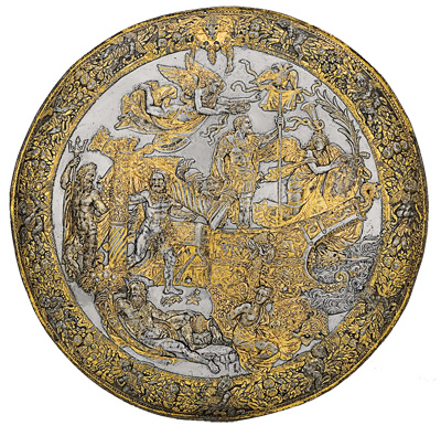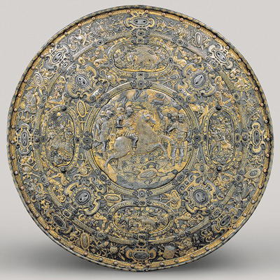 The German shield at left was apparently made in competition with Filippo Negroli, the famed Milanese armorer who specialized in armor with raised, or embossed, decoration. On the upper part of the rim, a bull lunges to gore a warrior holding a tiny shield labeled "Negrol" (written backward)—Helmschmid’s boast that he could surpass his rival. In the circular inscription at the center, Desiderius proudly describes himself as "Armorer to His Imperial Majesty." The four medallions depict the Triumphs of Wisdom, Peace, War, and Strength.