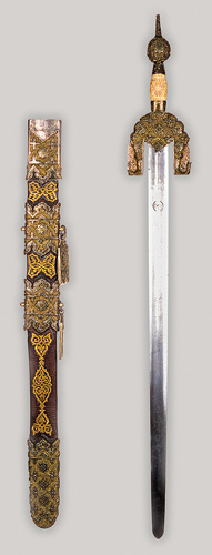 This finely worked enameled sword is a trophy of war, captured in battle against the forces of Muhammad XII, the last Nasrid ruler of Granada. He was known as Boabdil (a corruption of Abu Abdullah, his given name) by the Spanish.