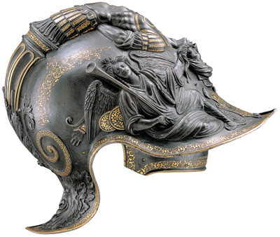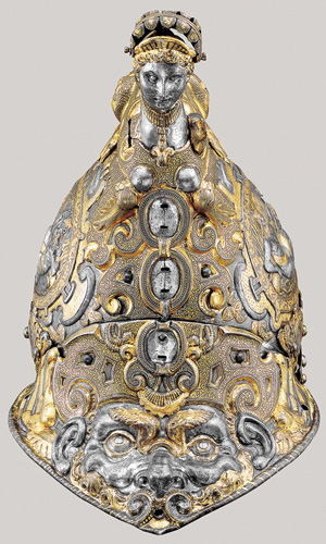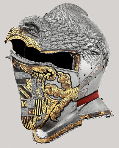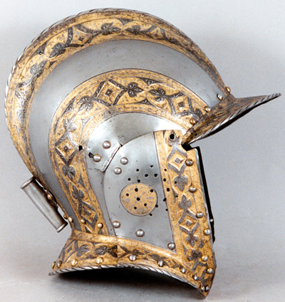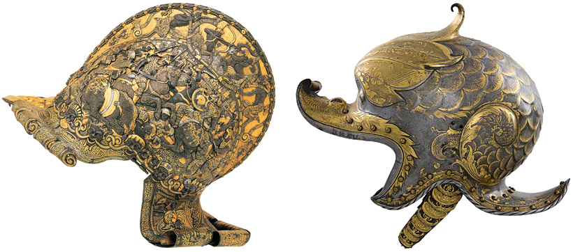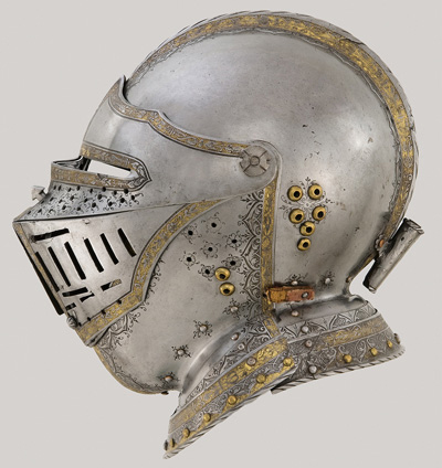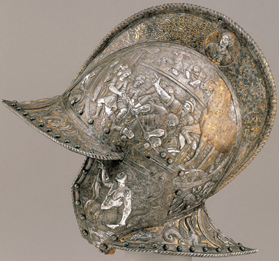 (left) Italian, 16th Century, Helmet (Burgonet) of Philip II, Milan, c. 1560–1565 embossed, gold- and silver-damascened steel, Patrimonio Nacional, Real Armería, Madrid