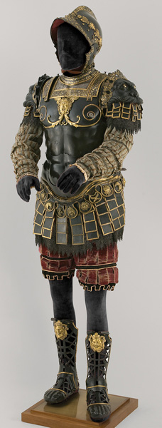 Bartolomeo Campi, Italian, died 1573, Roman-Style Armor Given to Philip II, Pesaro, 1546, embossed and gold- and silver-damascened steel; brass and fabric, Patrimonio Nacional, Real Armería, Madrid,