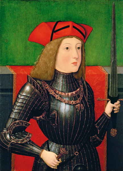 The son of Maximilian, Philip was born in the Burgundian Netherlands (modern Belgium), which he had inherited from his mother. After his marriage in 1496 to Joanna ("the Mad"), daughter of Ferdinand and Isabella, he became Philip I of Castile, the first Habsburg ruler in Spain. This portrait is the earliest known representation of an armor-clad king of Spain. Philip’s surcoat, worn under his coronation robe and over his armor, bears the arms of the Spanish kingdoms and Burgundy.