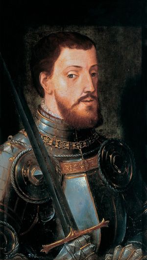 Philip II wore this armor at the Battle of Saint-Quentin against the French on August 10, 1557, when he won his first victory as king. The armor's association with triumph led the Netherlandish painter Anthonis Mor to portray the king dressed in part of the suit he wore on horseback "as he sallied forth on the day of Saint-Quentin." The same armor appears in Carreño de Miranda's portrait of Charles II, Philip's great-grandson. Both paintings preserve the armor's original blackened surface, which once set off the gilded decoration, but has worn away over the centuries.