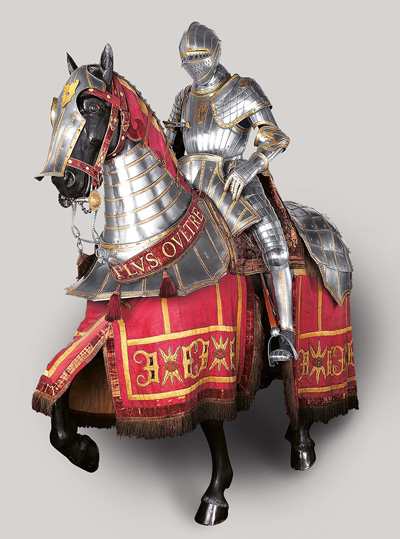 Maximilian's equestrian armor portraying feats of strength by Hercules and Samson, also presents him as the successor to heroes of antiquity.