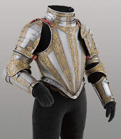 Kolman Helmschmid, German, c. 1470–1532, Armor of Emperor Charles V, Augsburg, c. 1525, etched and gilt steel, leather, Patrimonio Nacional, Real Armería, Madrid