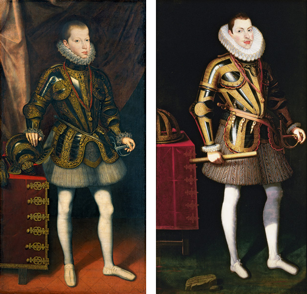 As the youngest of Philip II's four sons, Philip III (1598–1621) was an unlikely successor to the throne. The presumed heir, the mentally unbalanced Don Carlos, died after he was deemed unfit to rule and two brothers did not survive early childhood. The suits of armor here were made for Prince Philip when he was seven, the year he took the oath as Prince of Asturias, the title for the heir apparent. Because that event relieved fears that the Habsburg dynasty in Spain would come to an end, suits of armor that had belonged to the seven-year-old prince took on special significance. Consequently, they appear in his portraits by Justus Tiel and Pantoja de la Cruz, even though Philip was by then older and would have outgrown the armor. He ascended to the throne in 1598 and ruled until his death at the age of forty-three.