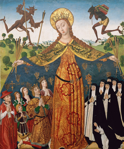 Mary is portrayed as the Virgin of Mercy who spreads her cloak to shelter the faithful from the dangers of sin, symbolized by two demons hurling arrows. At left, Ferdinand of Aragon and Isabella of Castile appear with their children and a cardinal. At right, a group of Cistercian nuns is led by an abbess, probably Leonor de Mendoza, the cardinal’s sister. She was the founder of the convent of Las Huelgas in Burgos, which still owns this altarpiece.