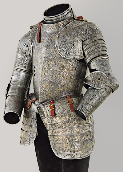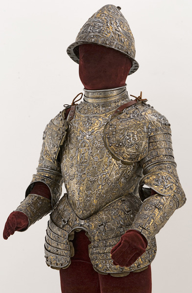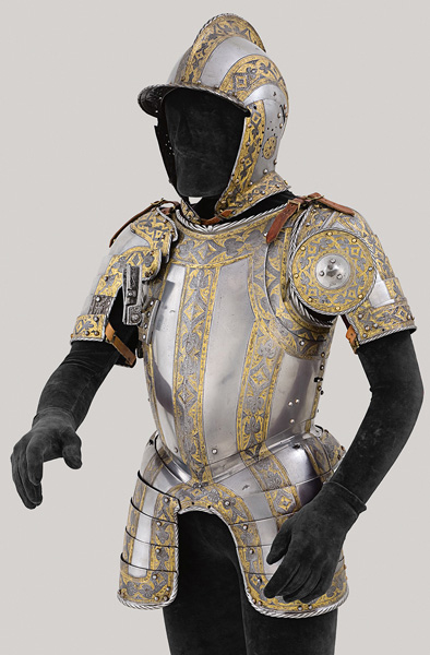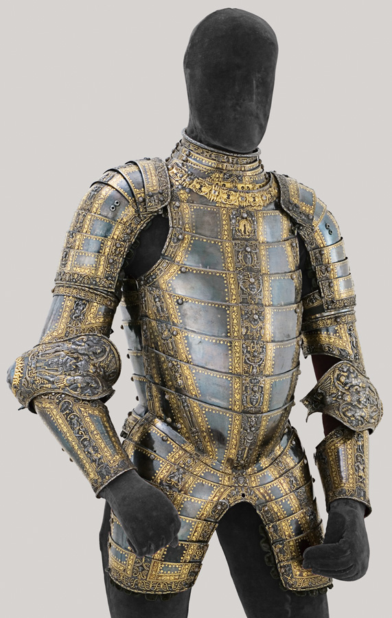 Desiderius Helmschmid, German, c. 1513–1579, Armor of Emperor Charles V, Augsburg, c. 1525, etched and gilt steel, leather, Patrimonio Nacional, Real Armería, Madrid