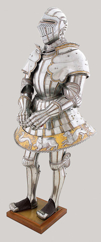 Royal armor in the Renaissance was far more than protective equipment for the battlefield. Most often worn at court ceremonies and in parades, pageants, and jousting tournaments, it proclaimed the rulers' strength and power. Elaborately decorated with imagery drawn from history, mythology, or the Bible, armor symbolically presented emperors and kings as the new Caesar, the equal of Hercules and other ancient heroes, the defender of the faith, or the model of chivalry. Etched or engraved images of saints or the Virgin and Child asserted that the rulers enjoyed divine protection. Much more costly than portraits by the leading painters of the day, suits of royal armor are dazzling works of wearable sculpture that affirmed their owners' right to govern.
