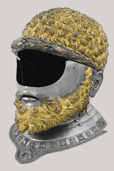 (right) Kolman Helmschmid, German, c. 1470–1532, Helmet (Burgonet) of Emperor Charles V, Augsburg, c. 1530, etched, embossed, and gold-damascened steel; fabric and leather, Patrimonio Nacional, Real Armería, Madrid