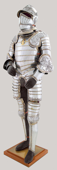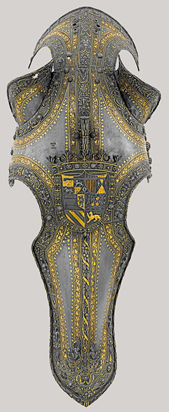 Before ascending to the Spanish throne, Charles lived in the Burgundian Netherlands, where he had been born in 1500. Raised there by Maximilian's daughter, he shared his grandfather's preference for German armorers. Charles' patronage of Kolman and Desiderius Helmschmid of Augsburg brought them fame and set a fashion for elegant armor in which smooth surfaces alternate with vertical bands of gilded and engraved decoration. As a result of his conquest of the Duchy of Milan in 1525, Charles also gained access to the renowned workshop of Filippo Negroli, the sole armorer mentioned by Giorgio Vasari in his Lives of the Artists of 1550. Charles' lavish commissions made the Royal Armory one of the greatest repositories of German and Italian armor in existence.