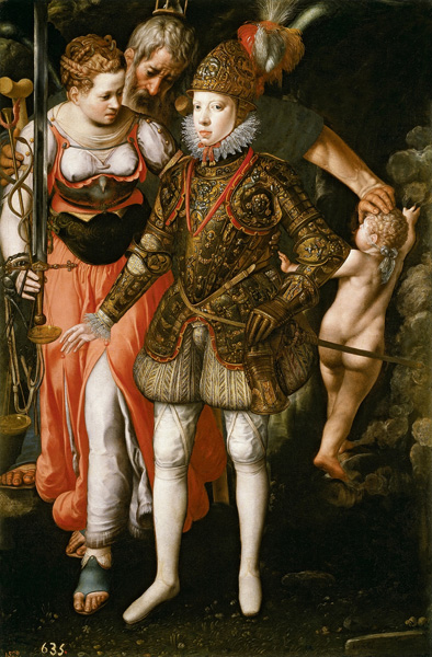 By the time of Justus Tiel's portrait, Philip was twelve years old and could not have posed wearing the armor. Its imagery probably inspired this painting, which also alludes to the virtues expected of a future king. Tiel portrayed the prince attended by a female figure of Justice who hands him scales and a sword, symbolizing prudence and power; the staff, known as a caduceus, representing peace; and a bridle and reins, suggesting moderation and restraint. Behind them, Chronos (Time) pushes blind Cupid aside and Justice forward. The hourglass with a still-empty lower chamber balanced on Chronos' head signifies the prince's youth.