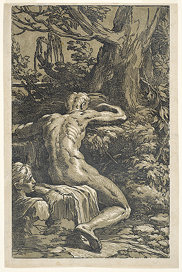 Antonio da Trento, Nude Man Seen from Behind (Narcissus), after Parmigianino, c. 1527–1530, chiaroscuro woodcut from two blocks, Harvard Art Museums / Fogg Museum, Gray Collection of Engravings Fund, G7500
