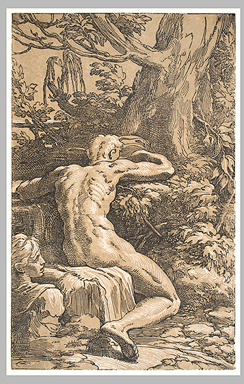 Antonio da Trento, Nude Man Seen from Behind (Narcissus), after Parmigianino, c. 1527–1530, chiaroscuro woodcut from two blocks, Philadelphia Museum of Art: The Muriel and Philip Berman Gift, acquired from the John S. Philips bequest of 1876 to the Pennsylvania Academy of the Fine Arts, with funds contributed by Muriel and Philip Berman, gifts (by exchange) of Lisa Norris Elkins, Bryant W. Langston, Samuel S. White 3rd and Vera White, with additional funds contributed by John Howard McFadden, Jr., Thomas Skelton Harrison, and the Philip H. and A.S.W. Rosenbach Foundation, 1985, 1985-52-556