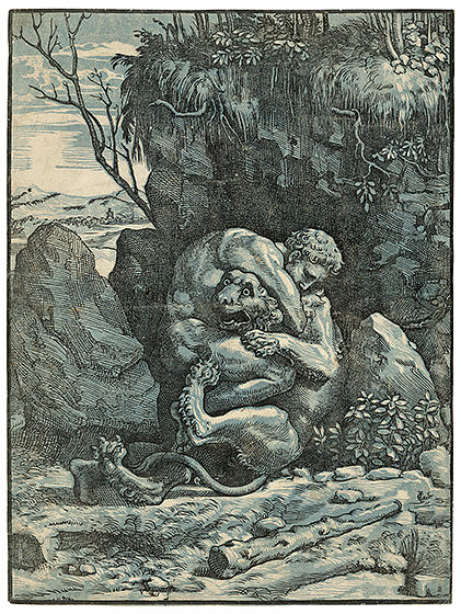 Ugo da Carpi, Hercules and the Nemean Lion, after Raphael or Giulio Romano, c. 1517–1518, chiaroscuro woodcut from two blocks, The British Museum, London, 1920,0420.20