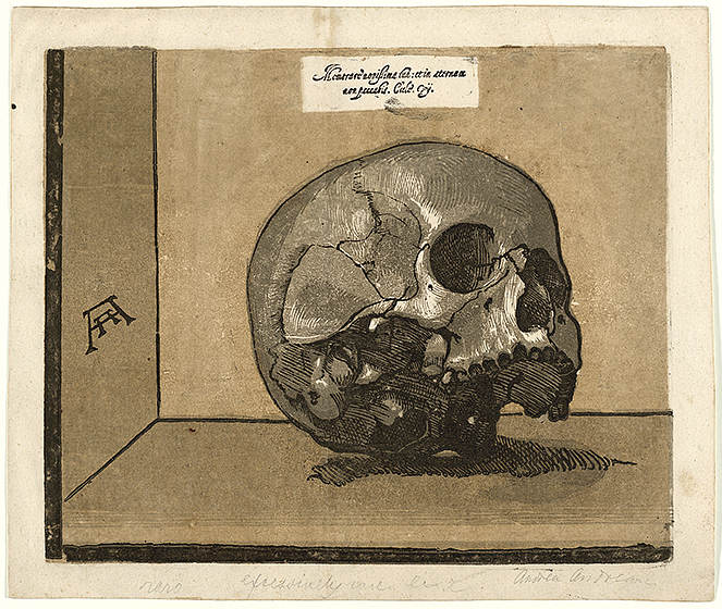 Andrea Andreani, A Skull, after Giovanni Fortuna (?), c. 1588, chiaroscuro woodcut from five blocks, The British Museum, London, 1861,0518.199