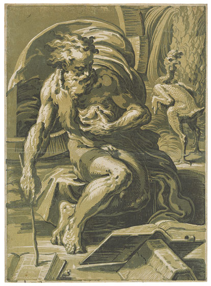 Ugo da Carpi, Diogenes, after Parmigianino, c. 1527–1530, chiaroscuro woodcut from four blocks, state i/iii, Blanton Museum of Art, The University of Texas at Austin, Purchase through the generosity of Julia and Stephen Wilkinson, 2005.16
