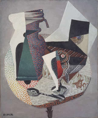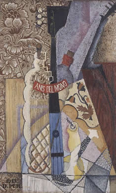 Rivera's interest in themes of memory and experience is revealed in his personal interpretation of cubism. By 1913 Rivera had fully embraced the pictorial language of cubism in canvases such as Still Life with Balalaika. Here the artist imbued familiar cubist motifs--a bottle and a musical instrument--with deeply personal resonance. The Spanish liqueur Anís del Mono, for example, alludes to Rivera's recent stay in Toledo. The distinctive faceted bottle also calls to mind the work of renowned Spaniards Picasso and fellow cubist Juan Gris, who similarly had included the Spanish liqueur bottle in their cubist works. Rivera's inclusion of a Russian balalaika evokes his Russian companion, Angelina Beloff, and their joint studio space where the three-stringed instruments were displayed, while the floral pattern is drawn from their studio curtains.
