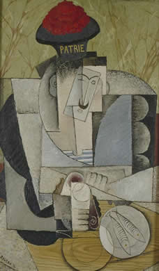 Like many cubist works executed on the eve of World War I, Sailor at Lunch reflects the rising tide of French nationalism. Rivera's geometrized sailor--in the process of taking a drink at a wood-grain café table--wears a prominent cap with an oversized crimson pompom as part of his uniform, emblazoned with the word "patrie" (homeland). Rivera's reference to France and its navy undoubtedly alluded to his loyalty to that country. Yet the term "patrie" not only invokes French patriotism, but also poignantly recalls Rivera's own homeland, from which he was so far removed.