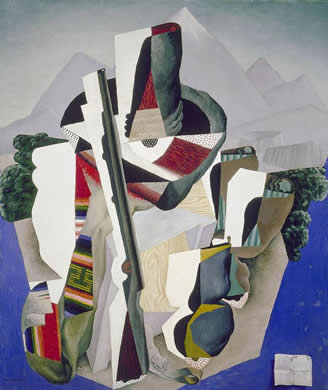 Executed in the summer of 1915 at the height of the Mexican Revolution, Zapatista Landscape illustrates the increasing politicization of Rivera's work. The depicted objects (sombrero, serape, rifle, and cartridge belt), placed before the mountains of the Valley of Mexico, evoke the peasant revolution. This amalgamation of still-life and landscape genres is, above all, a symbolic portrait of Mexico. Indeed, its more specific title was acquired later. Rivera would state that his so-called "Mexican trophy" was "probably the most faithful expression of the Mexican mood that I have ever achieved."