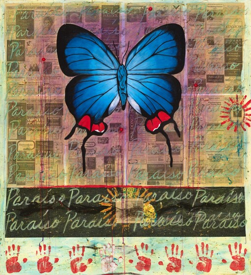 Freddy Rodríguez, Paradise for a Tourist Brochure, 1990, acrylic, sawdust, and newspaper collage on canvas, Gift of Funds from The Ahmanson Foundation, and Patrons' Permanent Fund, 2022.45.1