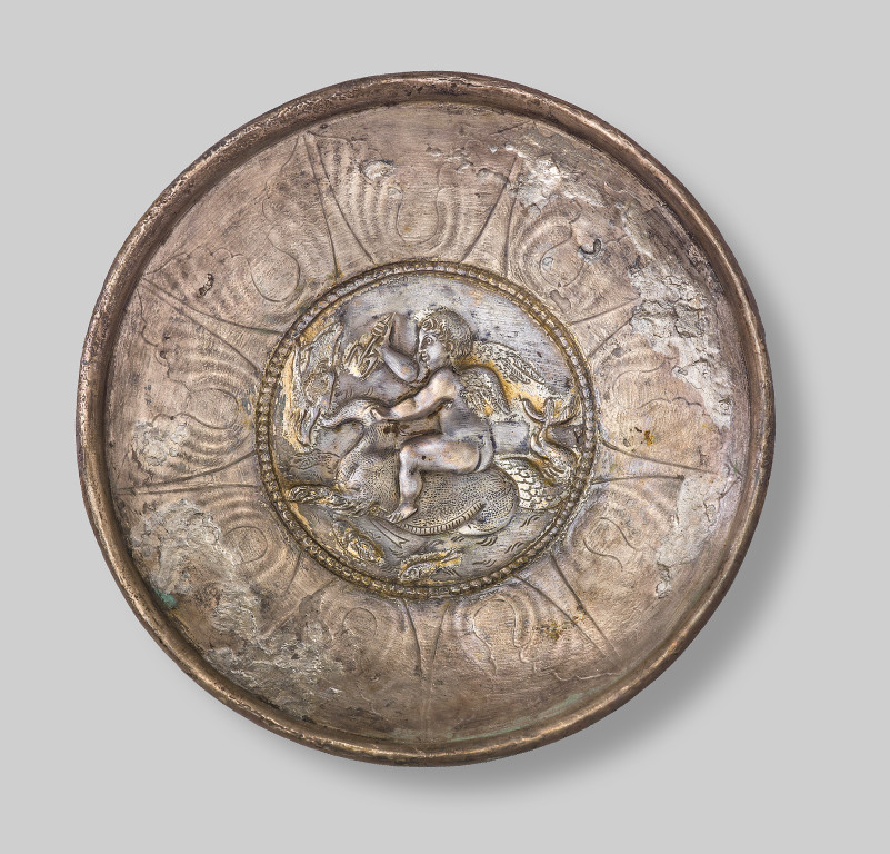 Plate with Eros riding a sea monster, Egypt, 6th–7th century, silver with gilding, Athens, Benaki Museum
