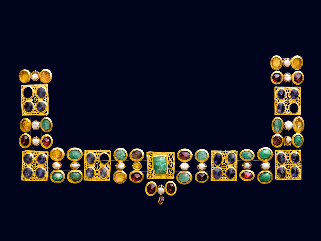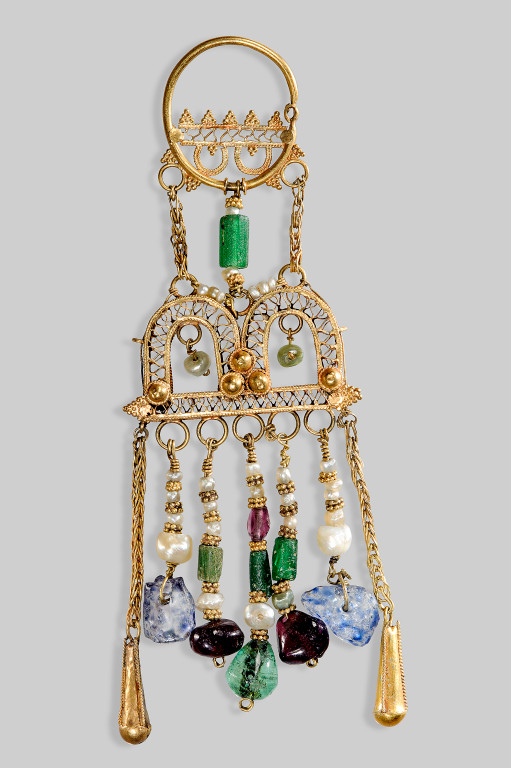 Earring or ornament for a diadem, Crete, first half of 10th century, gold, garnets, pearls, sapphires, emeralds, and glass, Athens, National Archaeological Museum, Stathatos Collection