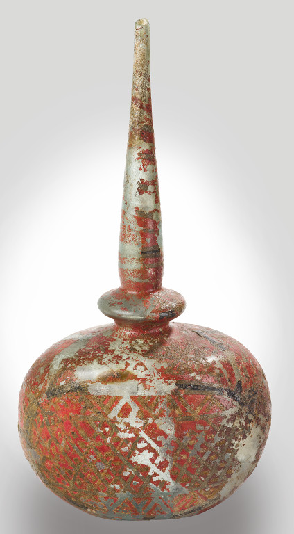 Perfume flask, Southeast Mediterranean, probably Syria; possibly decorated in Byzantium, 13th – 14th century, glass, Thessaloniki, Museum of Byzantine Culture