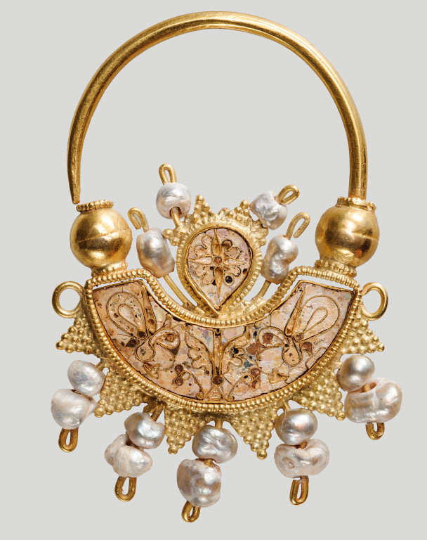 Crescent-shaped Earring, 10th century, gold, pearls, and cloisonné enamel, Provenance: Heraklion, Crete, Heraklion, Historical Museum of Crete