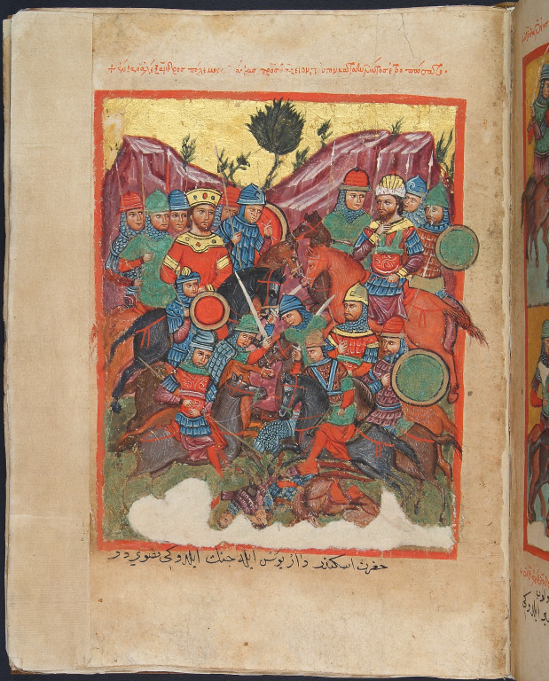 A fanciful interpretation of the life and adventures of Alexander the Great, the Romance was hugely popular in the Middle Ages. The original Greek version, written possibly as early as the third century BC, was translated into several languages, including Latin, French, German, and English. This lavishly illustrated copy was probably made for Alexios III Komnenos, emperor of a Byzantine state on the Black Sea from 1349 to 1390. After its capital, Trebizond, fell to the Ottomans in 1461, the manuscript came into Turkish hands and Arabic captions were added to the miniatures.