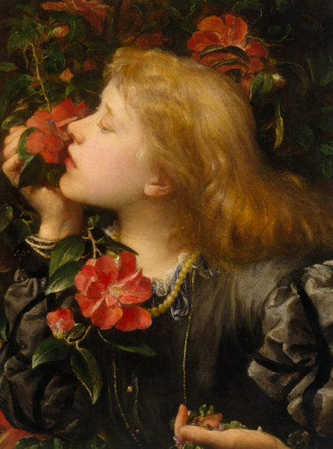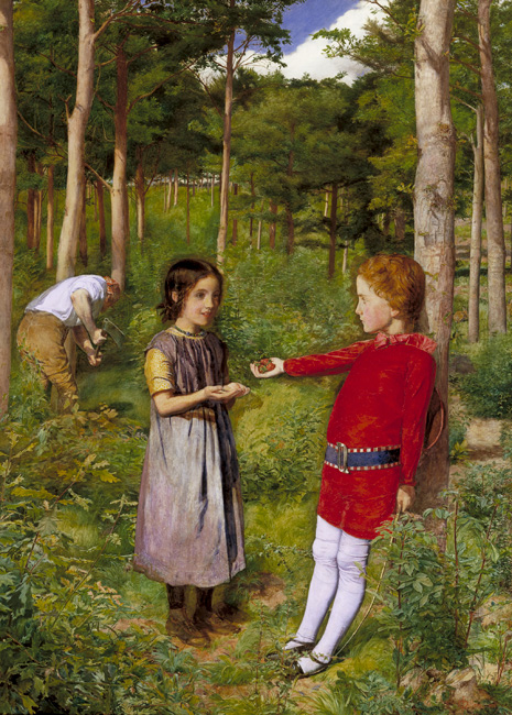 The tragic romance between the son of a squire and Maud, the daughter of a woodsman, is chronicled in a poem by Millais' friend Coventry Patmore. Here Millais depicted the future lovers as childhood friends. The young boy tempts the girl with strawberries, foreshadowing later events, as her father works behind them. The story ends with Maud's ruin: she goes mad after drowning their illegitimate child. Fulfilling the ideals of the Pre-Raphaelites, Millais painted the background details directly from nature.