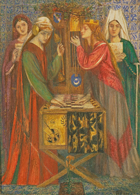 Music makes a frequent appearance in Pre-Raphaelite paintings, complementing delights for the eye with pleasures for the ear. Highly ornamented works such as this one derive from Rossetti's passion for medieval manuscript illumination, though the musical instruments shown here are purely imaginary. The designer and poet William Morris purchased this vibrant watercolor. It inspired him to write a poem of the same name, which begins "Lady Alice, Lady Louise, / Between the wash of the tumbling seas / We are ready to sing, if so ye please: / So lay your long hands on the keys...."