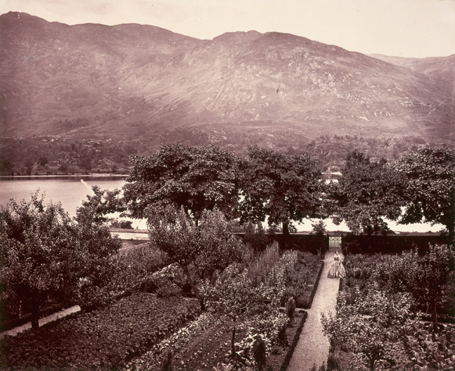 The light reflecting off the foliage in this bird's-eye view of a Scottish garden resembles a dusting of snow (a common effect in early landscape photographs). Drummond made his albumen prints with a variation called the malt process, which produced particularly rich purple tones.