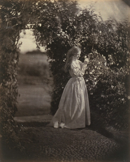 Drawn from Tennyson's poem The Gardener's Daughter (1842), this photograph illustrates the title character, Rose. The narrator, an artist, falls in love when he happens upon her trying to reattach a fallen rose: "Gown'd in pure white, that fitted to the shape— / Holding the bush, to fix it back, she stood. / A single stream of all her soft brown hair / Pour'd on one side.…"