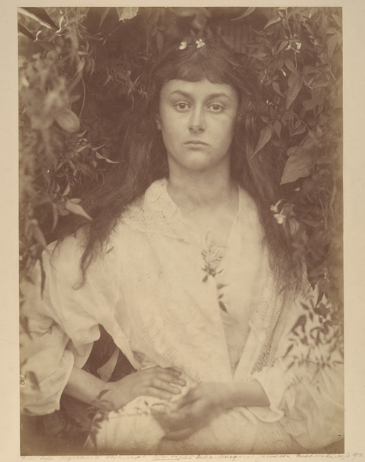 Cameron's distinctive large-scale images of single female figures in a shallow space evoke Rossetti's poetic paintings of women. To illustrate the Roman goddess of fruitfulness, Cameron placed the model Alice Liddell against flowering vines and allowed her hair to blend into the leaves. As a young girl, Liddell had been Lewis Carroll's muse for Alice's Adventures in Wonderland (1865).