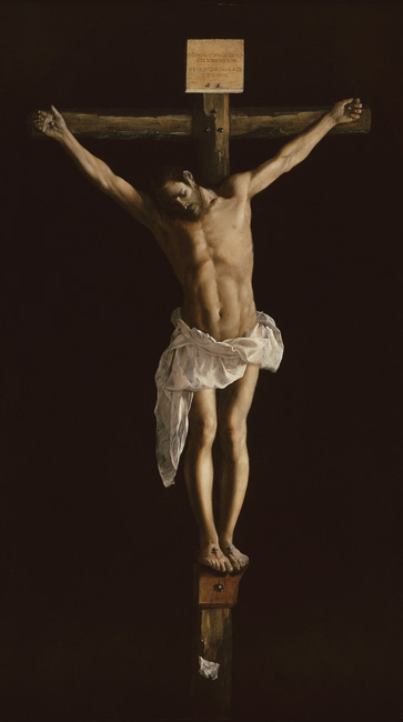Zurbarán designed this painting for an arched alcove above an altar in a chapel of the Dominican friary of San Pablo in Seville (no. 24). Nailed to a rough-hewn cross, Christ's lifeless body emerges from impenetrable blackness, illuminated only by the bright light from an unseen window on the right. The scene is devoid of narrative detail, forcing the viewer to focus on Christ's sacrifice. In the luminous flesh and crisp folds of the loincloth, Zurbarán takes the illusion of reality to a new level.