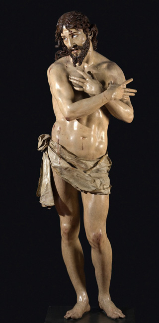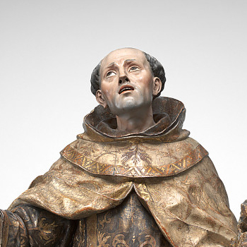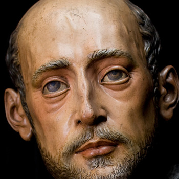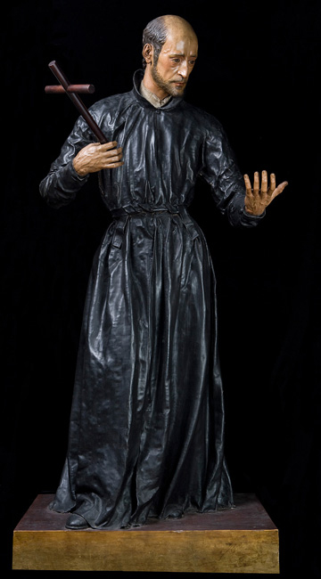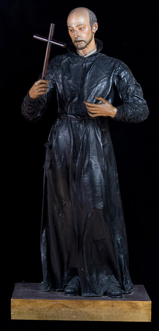 In 1609, to mark Ignatius' beatification (a level of veneration preceding sainthood), the Jesuits commissioned Montañés and Pacheco to create the sculpture of him displayed here. To capture a true likeness, they relied on Ignatius' death mask, a plaster copy of which Pacheco owned. Pacheco proclaimed their portrait of the saint the best of all representations "because it seems really alive." As with most of the images of holy figures in the exhibition, whether sculptures or paintings, the impact is enhanced by the fact that the saint is shown life-size.