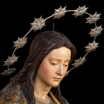 The Immaculate Conception—the belief that the Virgin Mary was born free of original sin—was a theologically complex doctrine, hotly debated in religious circles since the Middle Ages. The subject was particularly popular in Seville because the city had a special devotion to the Virgin. Sculptors and painters such as Montañés and Pacheco worked together in establishing an orthodox image of the Immaculate Virgin. Artists took as their chief source the description found in the Book of Revelation (12:1–12:2) of "a woman clothed with the sun, and the moon under her feet, and upon her head a crown of 12 stars. . . ." Pacheco further stipulated in his treatise that the Virgin should be represented as a beautiful 12- or 13-year-old girl with "fine and serious eyes."