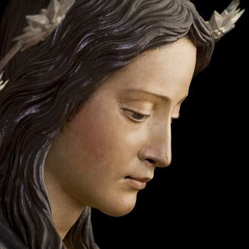This sculpture is an imagen de vestir, a mannequin-like figure in which only the head and hands are carved and painted. The rest of the figure is covered in real clothing. The polychromy is a fine example of Pacheco's matte technique, which he believed was more naturalistic for the flesh tones than a glossy varnish. The black tunic, made from cloth stiffened with glue, may have been added in the 19th century.