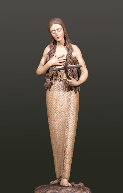 The Magdalene renounced her dissolute ways when she became one of Christ's followers. After the Crucifixion, she adopted a life of austerity and penitence. Here, she meditates on the small crucifix that she holds in her left hand. She steps forward in a dynamic pose, her right hand clasped to her breast, overwhelmed by the empathy she feels for Christ's suffering. Mary wears a simple shift that was carved to appear as though coarsely woven from grass.