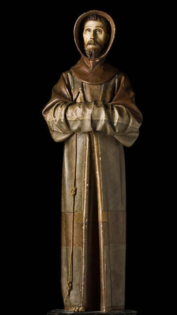 In 1449 Pope Nicholas V and a small retinue entered the crypt in which Saint Francis was entombed in Assisi to pay homage to him. They were amazed to discover that, although the saint had died more than two hundred years before, his body was miraculously preserved and standing upright, his eyes looking heavenward and his stigmata still bleeding. Images of this marvel, such as the ones by Zurbarán and Pedro de Mena (nos. 16, 17) were very popular in 17th-century Spain.