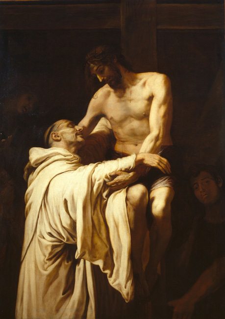 Ardent prayer before sculptures and paintings of Christ led some to experience a mystical union with him. Saint Bernard reputedly received Christ into his arms after praying in front of a sculpture of Christ on the cross. To communicate Bernard's visionary state, Ribalta shows him with his eyes closed and a rapturous smile on his face. The scene is remarkable for the way in which Christ seems transformed from a wood sculpture into a living being.