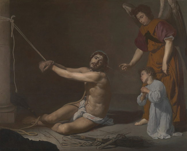 Velázquez depicts a rarely represented subject: following his flagellation by Roman soldiers, Christ is visited by a Christian soul in the form of a child, accompanied by a guardian angel. The Gospels tell only of Christ's scourging, but other religious texts dwelled on the moments after his flagellation. The figures of the angel and Christian soul seem to have been taken from life, as indicated by the angel's strapped-on wings, which look like a prop from an artist's studio. Because painters, unlike sculptors, could depict their subjects from only one vantage point, Velázquez used the gestures of the child and angel to direct attention to Christ's back, reminding viewers of the unseen wounds he had suffered.
