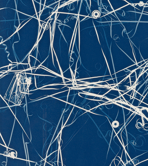A filmmaker and multimedia artist, Marclay explores the connections between sound recording, photography, film, and video. In 2003 he began to make cyanotype prints with audiocassette tapes, drawing together obsolete technologies from the 19th and 20th centuries. Introduced in 1842, cyanotypes are characterized by their blue tone, a result of the production of iron salts during the developing process; the heyday of audiocassette tapes was in the 1970s and 1980s. To create this work, Marclay unspooled cassettes (including A Gospel Reunion, seen in the lower left) across cyanotype paper and then exposed them to light. The unfocused composition of stretched and swirling lines recalls the allover nature of Jackson Pollock’s drip paintings, alluded to in the title, while the looping arcs reveal Marclay’s desire to visualize sound.