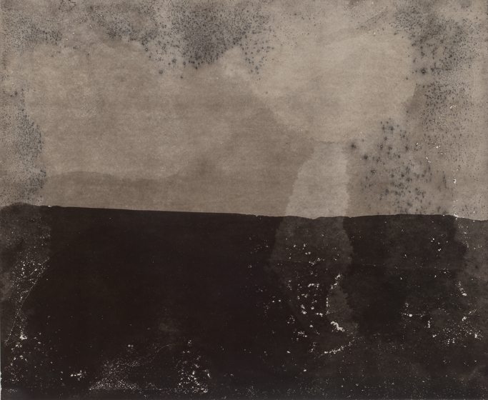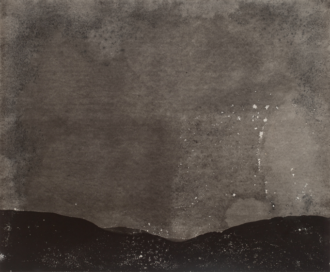 Rossiter’s pictures are created without a camera and instead use printing papers long past their expiration date. She develops them by dipping the sheets into solutions or pouring chemicals directly onto them. To produce these two prints, Rossiter used Kodak Azo paper that expired nearly 100 years ago. The results reveal the degradation of the paper caused by expired chemicals, light leaks, and changes in environmental conditions, but they also suggest a murky twilight landscape. The elegiac pictures mourn the passing of analog photography while offering a final glimpse of its beauty and creativity.