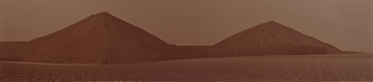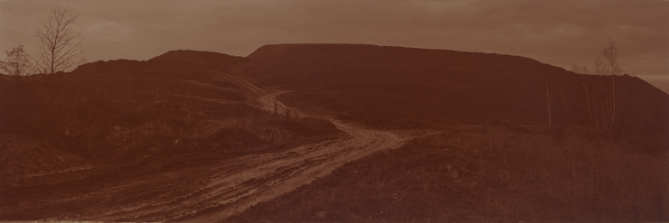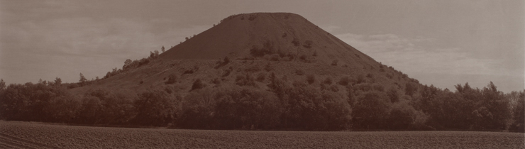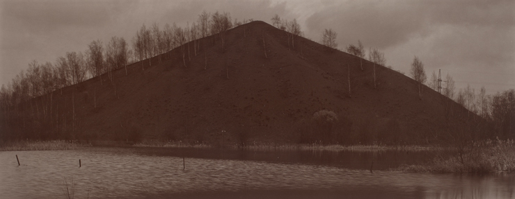 Worms' panoramic views of what at first appear to be natural hillsides are, in fact, industrial slag heaps—mounds of waste material produced by coal mining. His pictures of these manufactured landscapes document the ravages and remnants of industrialization as well as the rejuvenating forces of nature, where trees and grass implausibly grow out of the often toxic waste. To produce these photographs, Worms traveled to industrial ruins scattered across Europe, collecting coal from each slag heap, which he then ground into pigment to make his carbon prints. Reviving a 19th-century photographic technique, he combines subject and materials as one.