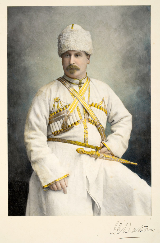 Hand-colored portrait of J. Guthrie Watson, the collector and possibly the photographer of some the images here, in ceremonial Cossack dress.