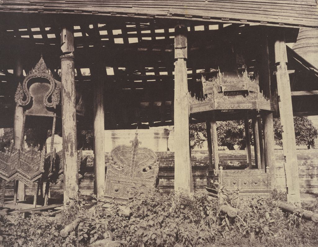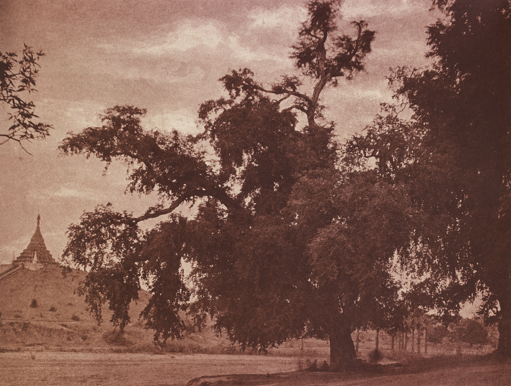 By contrasting the giant silhouetted tamarind tree in the foreground with the distant hilltop pagoda, Tripe adroitly revealed the natural and manmade wonder of Ye-nan-gyoung. Tripe and his fellow officers were impressed not only by the “striking and fantastic” beauty of the place but also by the pungent smell of the naturally occurring petroleum that permeated the air. (“Ye-nan-gyoung” means fetid water rivulet in Burmese.)