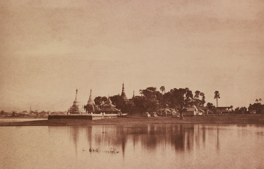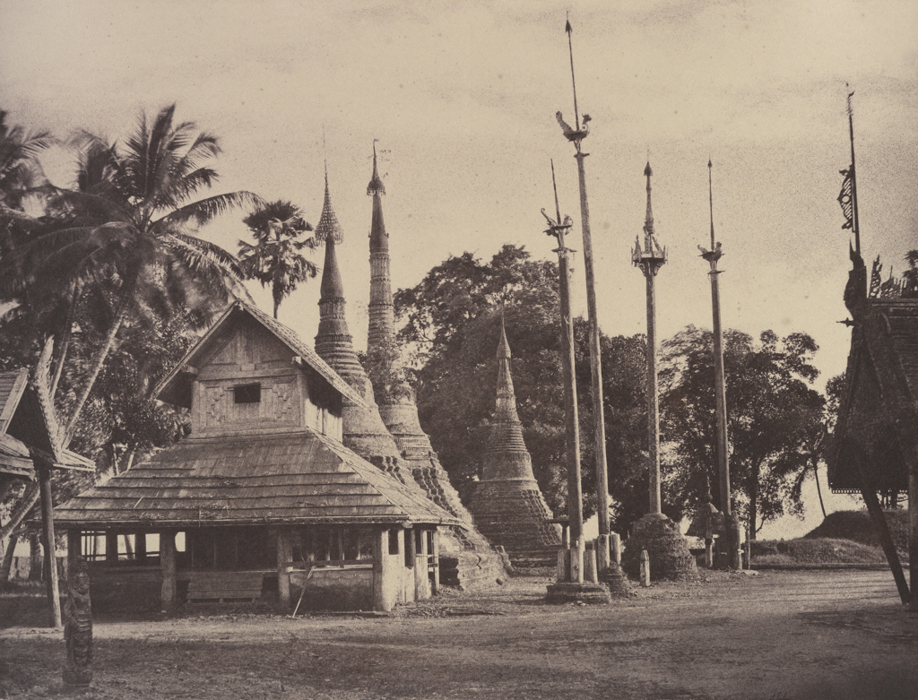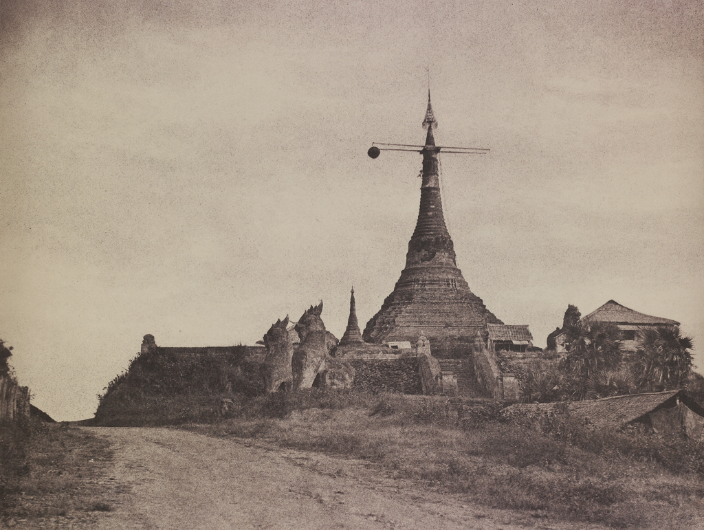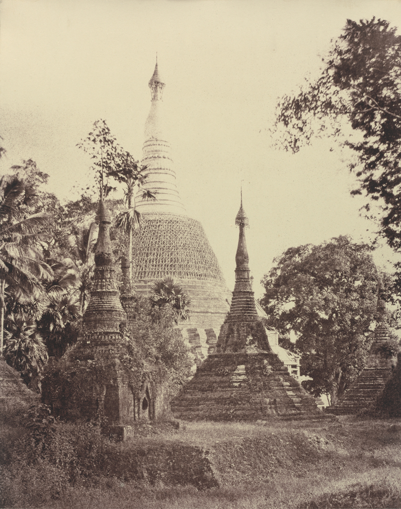 Like other major stupas, the Shwe Dagon Pagoda was regularly renovated. Tripe’s photograph shows the network of bamboo scaffolding that enabled workmen to regild its bell-shaped surface.
