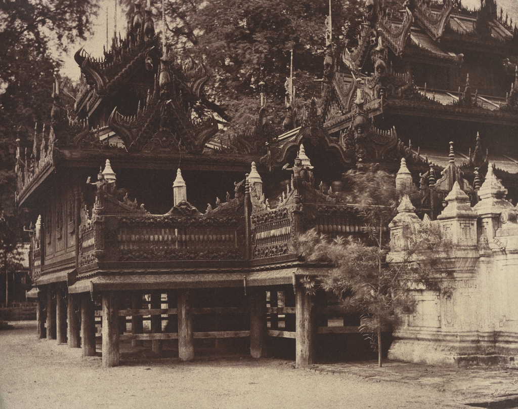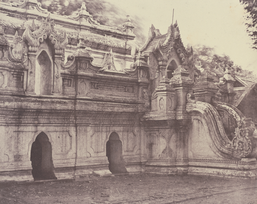 Most of the monasteries that Tripe encountered were made of wood, but a few monumental brick monasteries, such as this one, were constructed in the 18th century. In this photograph, Tripe focused on the massive staircase, with its sweeping balustrades and profuse ornamentation. The remains of this building today lie southwest of Mandalay.