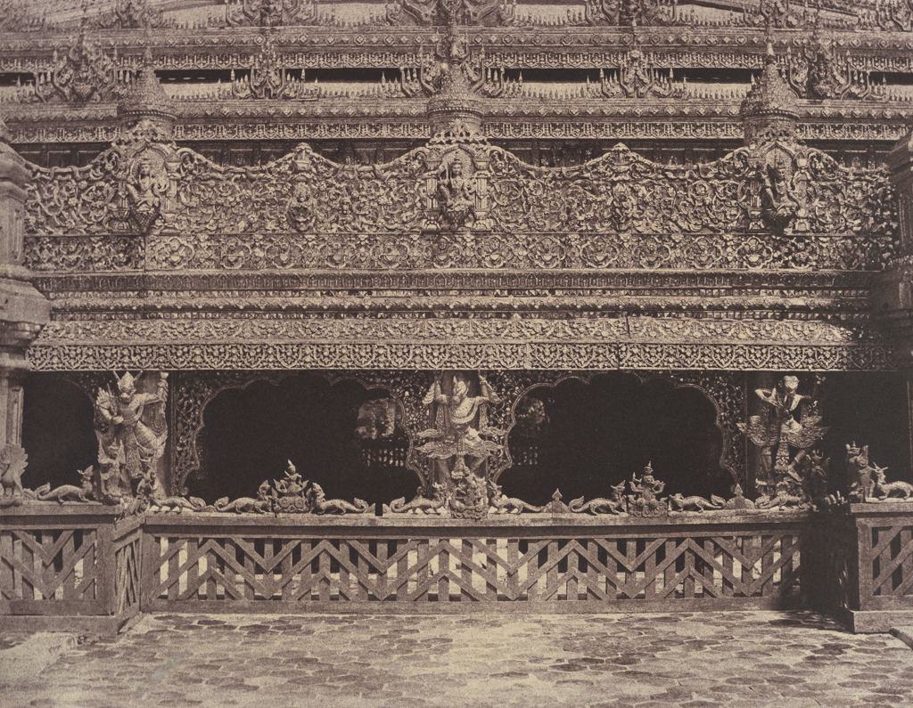 This elaborately carved wooden balcony, part of a complex of monastic buildings created during the reigns of Tharawadi (ruled 1837–1846) and Pagan (ruled 1846–1852), is often considered the zenith of Burmese woodcarving. This building survived until 1945.